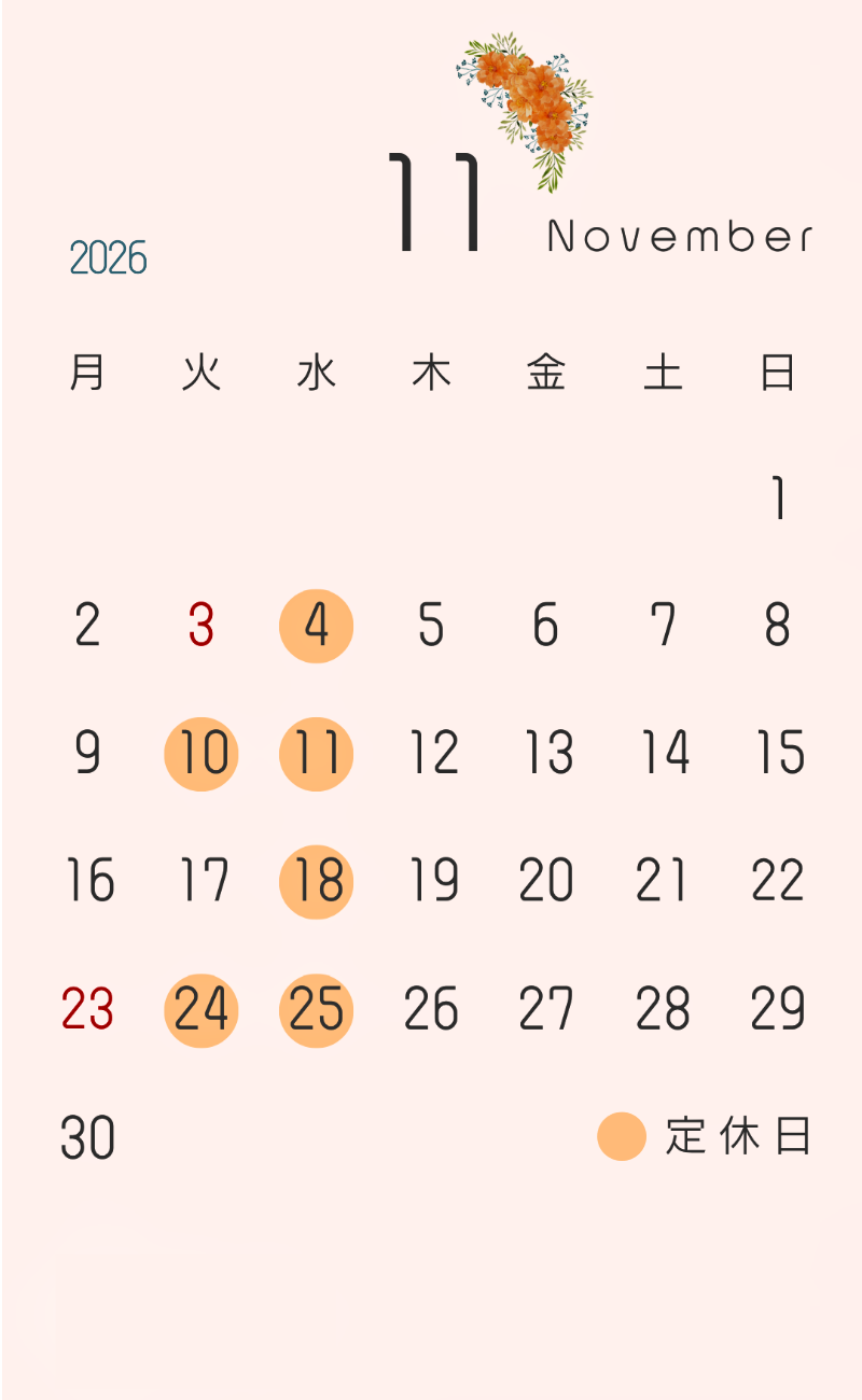 11月 5(水)、11(火)、12(水)、19(水)、25(火)、26(水)