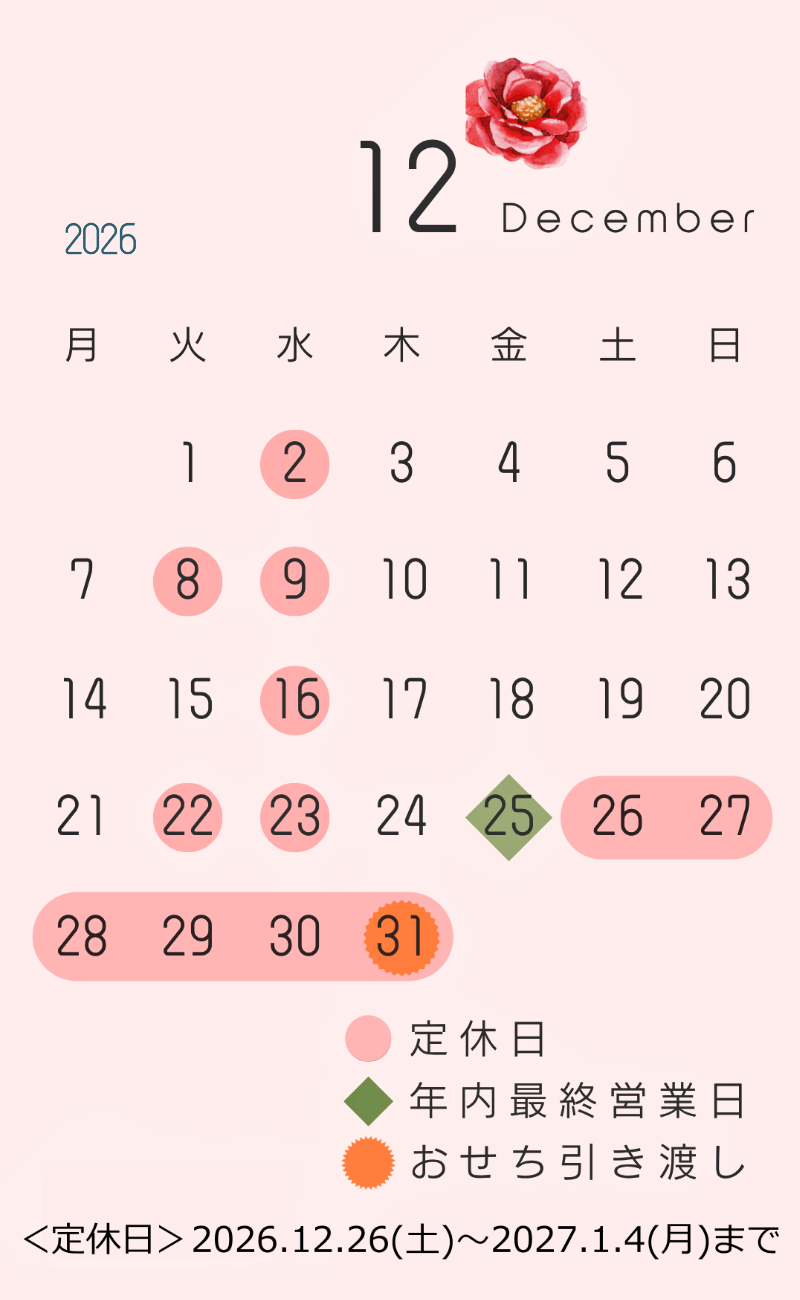 ※ 年末年始の定休日:2025月12月26日(金)から2026年1月4日(日)まで
